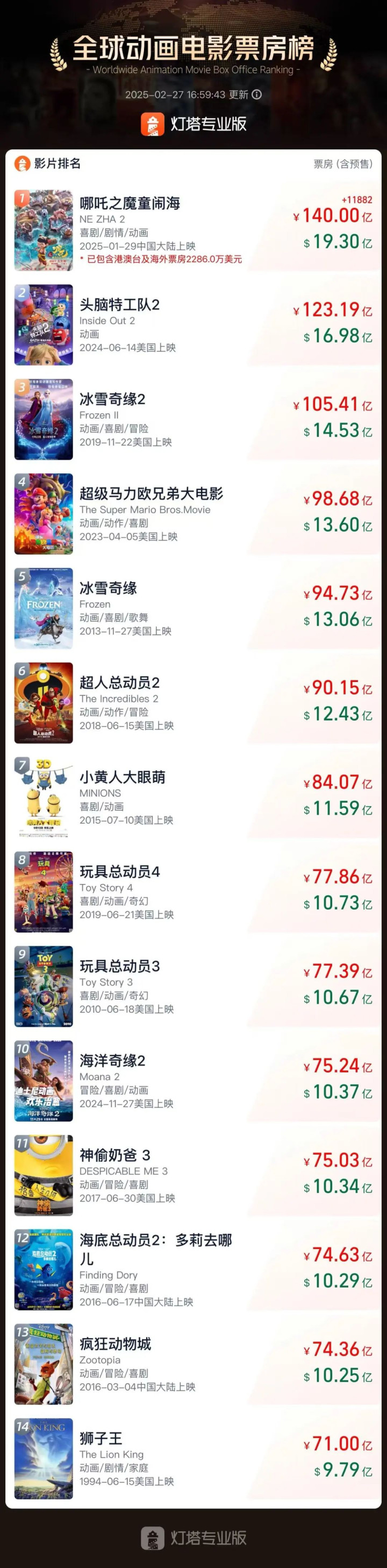 截至目前,据网络平台数据《哪吒之魔童闹海》全球累计票房(含预售及海外)突破140亿,暂列全球票房榜第8位!